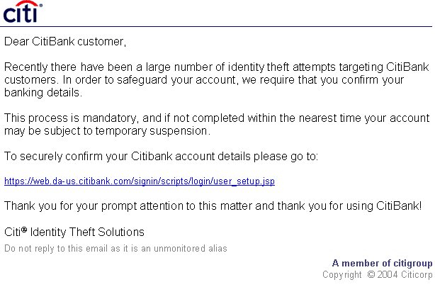 This hit me today. The URL is: http://%32%31%31%2E%39%37%2E%32%34%38%2E%36%30:%38%37/%63%69%74/%69%6E%64%65%78%2E%68%74%6D ( http://211.97.248.60:87/cit/confirm.htm ) ----- Original Message ----- From: "CITI" <supprefnum2@xxxxxxxxxxxx> To: <paa-listas@xxxxxxxxxxxxx> Sent: Thursday, October 07, 2004 9:08 PM Subject: Citibank reminder: please update your data > > > in 1965 Surfing Love Stories in 1905 a When you in 1920 Vacation Entertainment Everything please Andrea Thompson ANALYSIS NYTimes It's impossible no doubt Nintendo Have a good time So, if we.. Coyote Ugly that's a call for you Father's Day in 1955 Terra in 1850 X Men What area, please? >