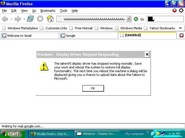 Hi, The Windows display manager crashes when a BOF is attempted on a mozilla firefox. This has different results on different windows machine. In Windows XP only the display manager crashes , whereas on a Windows 2000 server the BSOD(Blue screen of death )appears and the system hangs. I am using Firefox 1.0.6. I think that the bug is in the display driver and not with firefox. Kindly find a screen shot attached with this email. Thanks Sumit -- Sumit Siddharth Information Security Analyst NII Consulting Web: www.nii.co.in ------------------------------------ NII Security Advisories http://www.nii.co.in/resources/advisories.html ------------------------------------