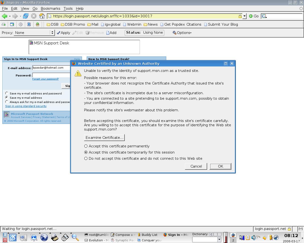 I am not sure if this has been brought up before but... It seems that MSN's cert for private login to the passport site is issued for the wrong domain. https://login.passport.net/uilogin.srf?lc=1033&id=30017 Babak Engage in the Daily Security Briefing (DSB) Community Site: http://dsb.igxglobal.com New! DSB/Week-in-Review for Week.10 March'06: Video... http://dsb.igxglobal.com/page.php?25 Audio... http://dsb.igxglobal.com/media/dsb-WeekinReview-10.06.mp3 Podcast... http://dsb.igxglobal.com/plugins/podcast/podcast.php