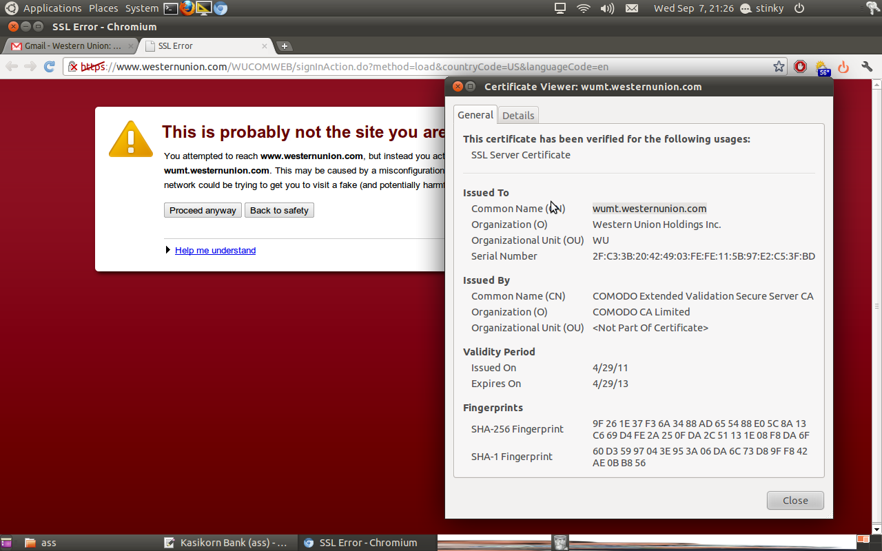 I recently got this error "You attempted to reach www.westernunion.com, but instead you actually reached a server identifying itself as wumt.westernunion.com. This may be caused by a misconfiguration on the server or by something more serious. An attacker on your network could be trying to get you to visit a fake (and potentially harmful) version of www.westernunion.com. You should not proceed." Attached is a screenshot of the error and certificate info. SHA-256=9F 26 1E 37 F3 6A 34 88 AD 65 54 88 E0 5C 8A 13 C6 69 D4 FE 2A 25 0F DA 2C 51 13 1E 08 F8 DA 6F Cert was issued by Comodo A google of the SHA comes up with ICANN but other sites come up with nothing... And then I read from comodo themselves they got breached and fraudulent certs were issued... http://www.comodo.com/Comodo-Fraud-Incident-2011-03-23.html CONFIDENTIALITY NOTICE This E-Mail transmission (and/or the documents accompanying it) is for the sole use of the intended recipient(s) and may contain information protected by the attorney-client privilege, the attorney-work-product doctrine or other applicable privileges or confidentiality laws or regulations. If you are not an intended recipient, you may not review, use, copy, disclose or distribute this message or any of the information contained in this message to anyone. If you are not the intended recipient, please contact the sender by reply e-mail and destroy all copies of this message and any attachments.