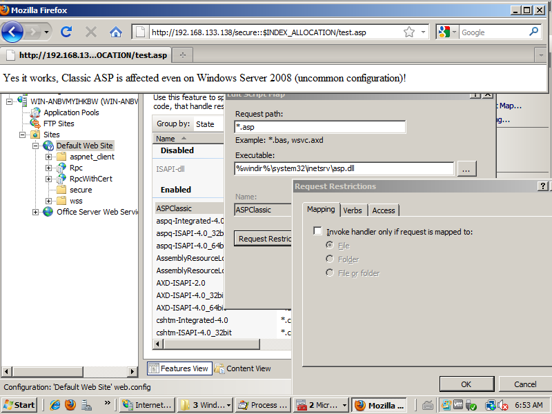 * Request http://<host>/<securefolder>::$INDEX_ALLOCATION/<aspfile>.asp
