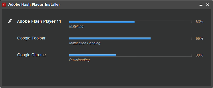 The company that writes the worlds most insecure software [1,2,3] has figured out a way to further increase an attack surface. Adobe now includes additional warez in their updates without consent. The warez includes a browser and tools bar. The attached image is what I got when I agreed to update Adobe Flash because of recent security vulnerability fixes. It appears Adobe has become a whore to Google like Mozilla. +1 Adobe. [1] http://www.google.com/#q=Adobe+site%3Asecurityfocus.com. [2] http://web.nvd.nist.gov/view/vuln/search-results?query=adobe&search_type=all&cves=on [3] http://lastwatchdog.com/adobe-surpasses-microsoft-favorite-hackers-target/ [4] http://www.theregister.co.uk/2009/12/29/security_predictions_2010/