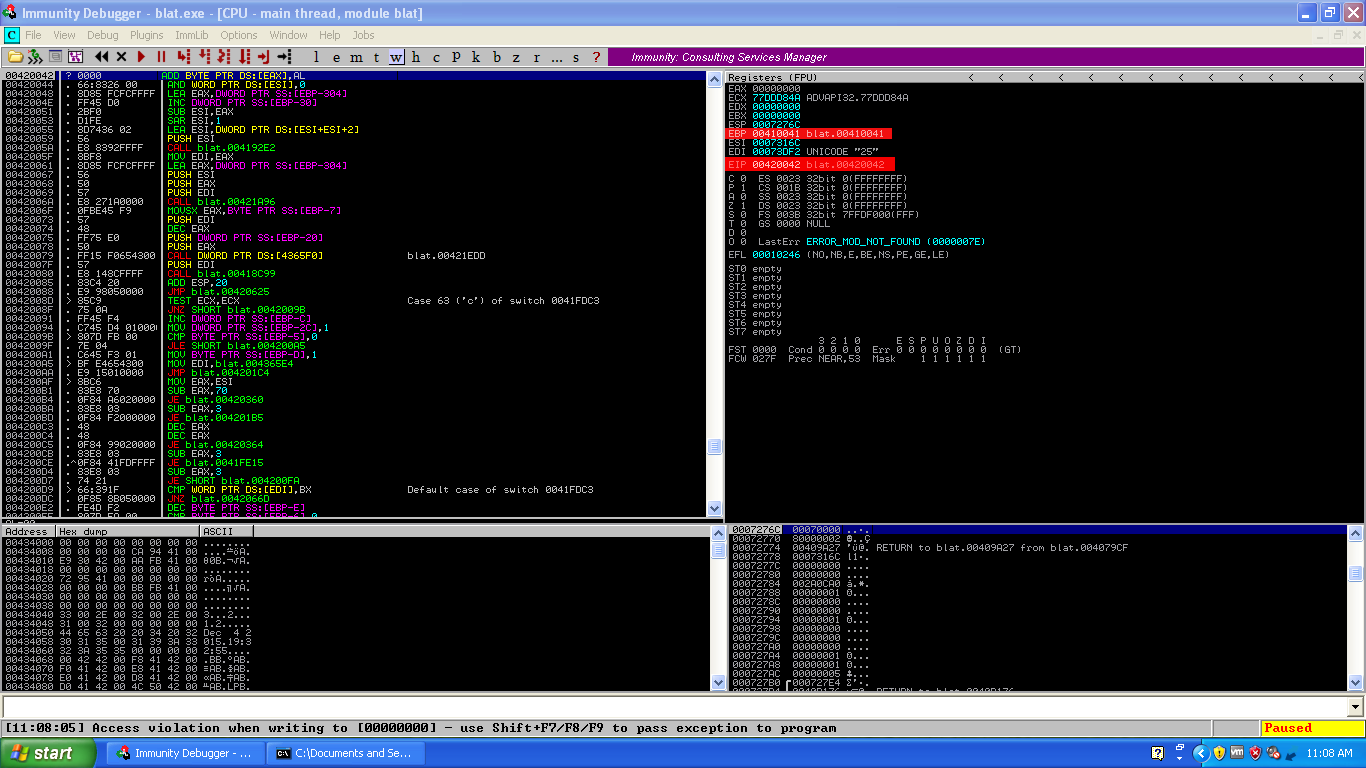 Feeding this command overwrites EBP with 0x00410041 and EIP with 0x00420042