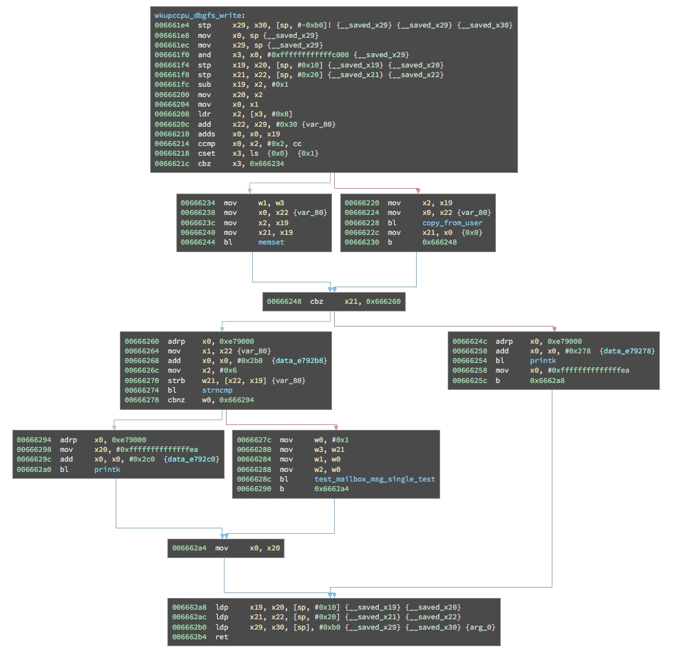 SSD Advisory – Huawei P8 wkupccpu debugfs Kernel Buffer Overflow Full report: https://blogs.securiteam.com/index.php/archives/3580 Twitter: @SecuriTeam_SSD Weibo: SecuriTeam_SSD Vulnerability Summary The following advisory describes a buffer overflow found in Huawei P8 Lite ALE-21 HI621sft, operating system versions EMUI 3.1 – wkupccpu debugfs driver. Huawei Technologies Co. Ltd. is “a multinational networking and telecommunications equipment and services company, it is the largest telecommunications equipment manufacturer in the world and the second largest smartphone manufacturer in the world” Credit A security researcher from, TRUEL IT, has reported this vulnerability to Beyond Security’s SecuriTeam Secure Disclosure program Vendor response Huawei confirmed that the vulnerability is not present on their most current version (with EMUI 4.0 or later), the only affected version is 3.1 and prior, it is recommended that all customers of Huawei upgrade to the latest version of their OS. Vulnerability details The vulnerability allows an attacker with root privileges in an unprivileged SELinux domain to execute arbitrary code in the kernel context. The vulnerable code can be found in the wkupccpu debugfs driver. File Kernel Binary Image – function pwrctrl_debug_init() @ 0xf9c714:3 See Image 005 The instructions at offset 0xf9c78c and 0xf9c7b8 in the pwrctrl_debug_init function are the one responsible of registering the debugfs directory and file in the filesystem, which is then mounted within the /sys/kernel/debug/ system directory The driver implements the write handler in its wkupccpu_dbgfs_write function: See image 007 It is good to have in mind the signature of a typical write implementation, which is: === ssize_t (*write) (struct file *, const char *, size_t, loff_t *); === The first basic block shown above prepares the stack and reserves 0xb0 (176) bytes for the local variables: register X1 will contain the pointer to const char * argument buffer provided by the user. Lines from offset 0x666208 to 0x666218 are the one responsible to check if the pointer to const char * argument provided by the user and its size provided as the size_t argument can cause an arithmetic overflow. In case of arithmetic overflow, the flow will be redirected to the basic block at offset 0x666234 and the vulnerability will not be triggered; otherwise, the execution will proceed to basic block at offset 0x666220, which contains the vulnerable copy_from_user call. The following is the state of the registers when this call is reached: X0 will hold the pointer to the destination buffer: the analysis highlights that the buffer is 0x8b (128) bytes longs and resides locally to the function X1 will hold the pointer to the source buffer, which resides in user space and is usersupplied X2 register will hold the number of bytes to copy, which is determined by the size ofthe buffer pointed by X1 Since we control the value of X2 register, we can provide a buffer wider than 128 bytes, causing an out-of-bounds write on the stack that could lead to memory corruption. -- Thanks Maor Shwartz Beyond Security GPG Key ID: 6D273779F52A9FC2