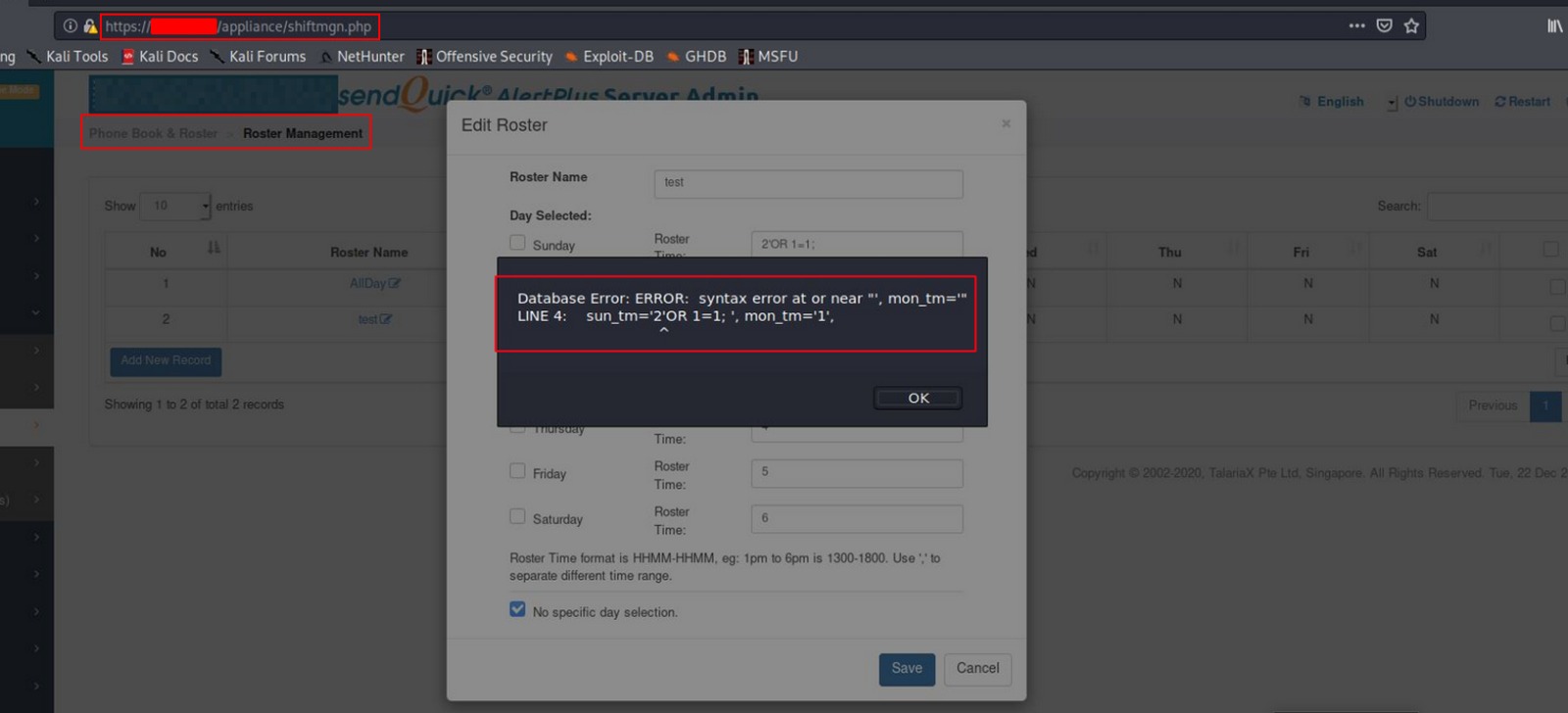 >> title: SQL injection vulnerability in Talariax sendQuick