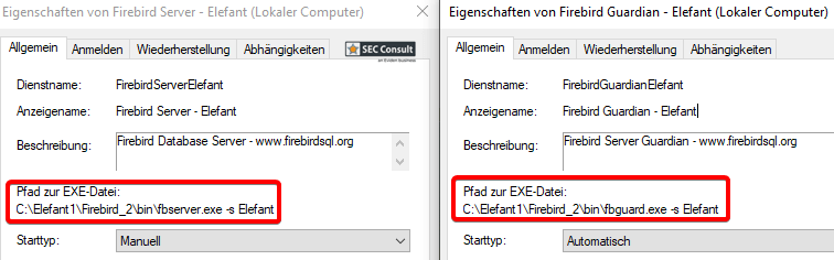 with the rights of the Firebird database ("NT AUTHORITY\SYSTEM").